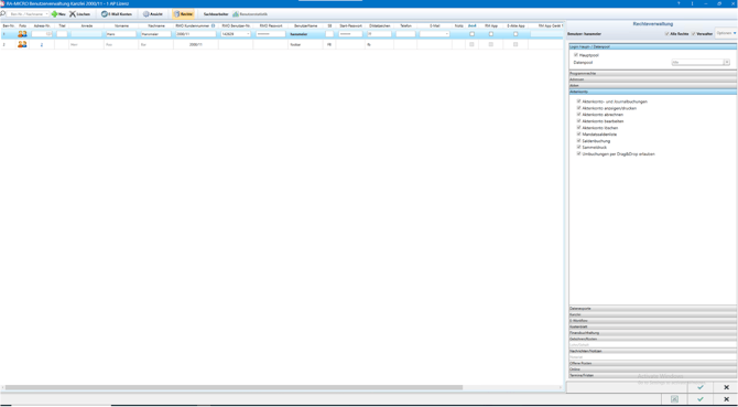 - Überprüfen Sie unter Benutzerverwaltung > Rechte die Zugriffsrechte für: Aktenkonto, Akte, Programmrechte, Datenexporte, Kanzlei und E-Workflow. Es müssten alle Rechte vergeben sein.