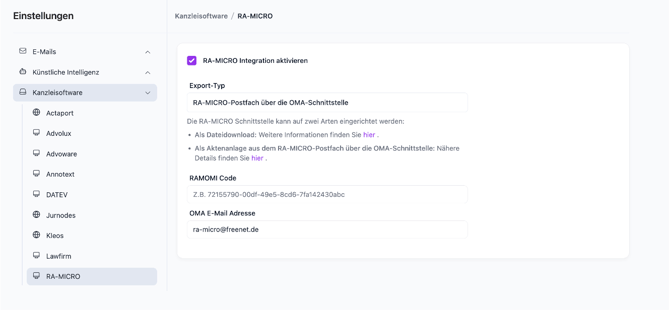 - Nachdem Sie in JUPUS in einer Anfrage auf "Akte anlegen" geklickt haben, sollten Sie auch eine Infomail über die Aktenanlage in Ihrem regulären E-Mail-Postfach der "OMA E-Mail Adresse" erhalten. Dies bestätigt das erfolgreiche Versenden der Akte. Im nächsten Schritt geht es entsprechend um Einstellungsmöglichkeiten zum Empfangen der Akte in RA-Micro.